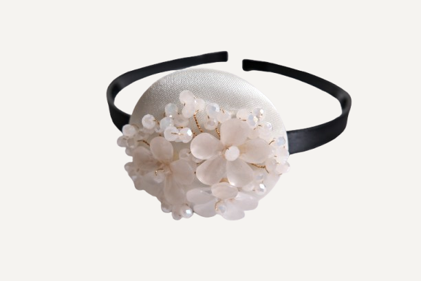 b. 白い花のつるが付いたチョバウィ (女の子用帽子)